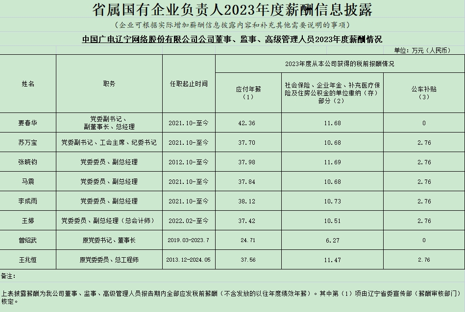 中國廣電遼寧網絡股份有限公司公司董事、監事、高級管理人員2023年度薪酬情況